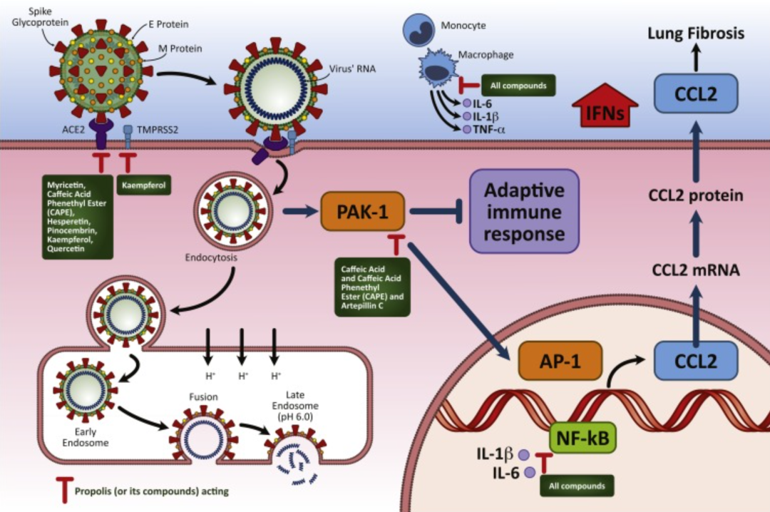 靶向病毒抑制:部分蜂膠成分與SARS?CoV?2關鍵蛋白(如 3CL^pro、ACE2)具有較高結合親和力,有潛在抗病毒作用。